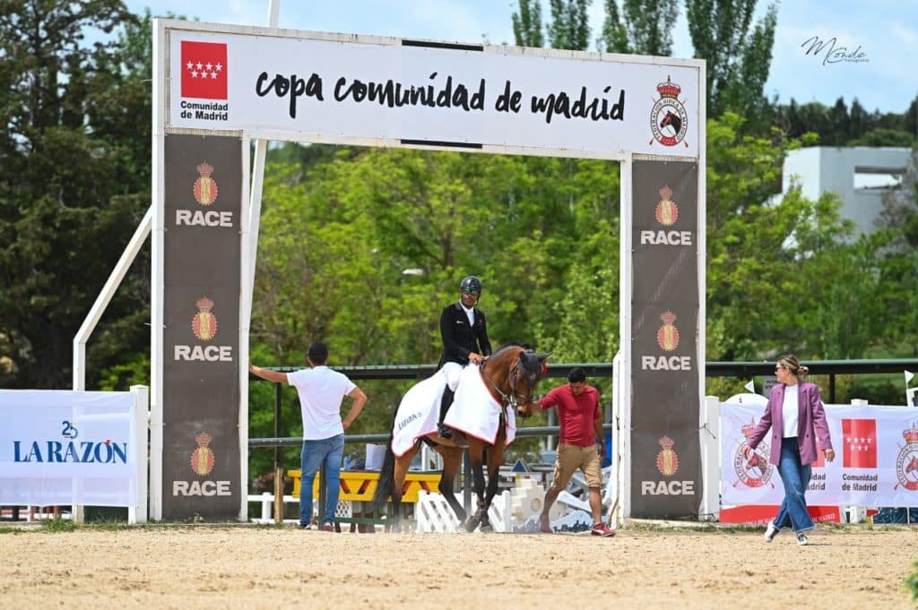 A continuación se disputó el Trofeo Copa Comunidad de Madrid, el cual daba nombre al concurso. Tras un primer recorrido, los 10 mejores binomios pasaban a disputar una manga ganadora sobre alturas de 1.45 y un trazado muy técnico diseñado por Chape Trenor. El formato de la competición no permitía a los jinetes salir con dos caballos, por lo que de haber clasificado dos, tenían que escoger uno. Ese fue el caso de la amazona Maya de la Joya, por ejemplo. Mariano Martínez Bastida a priori no entraba a disputar esta manga por haber hecho cuatro puntos con «Quark», pero fue afortunado con el formato de la prueba y entró a la manga ganadora. El murciano fue el primero en salir a pista, ya que salían en orden inverso a la clasificación del recorrido anterior. En el recorrido decisivo partían con cero puntos todos, Mariano y Quark fueron los más rápidos y ninguno de los otros nueve binomios fue capaz de rebajar su crono. Segundo fue Jesús Bamonde con «Caporal D’ Elle» y tercero Asís Arango con «Arizona Day», yegua criada por él. Orgullo de jinete y de criador.