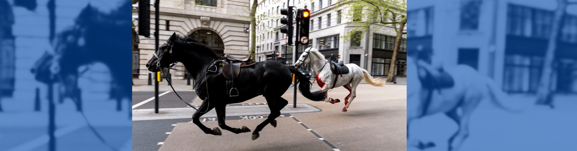 Caballos del Ejército Británico cubiertos de sangre galopando por el centro de Londres