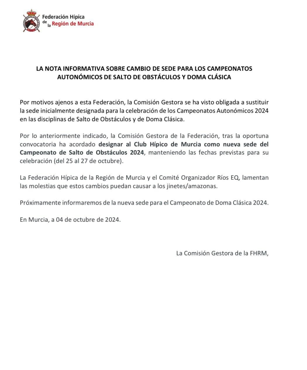 La Federación Hípica de la Región de Murcia ha anunciado un cambio de sede para los Campeonatos Autonómicos 2024 de Salto de Obstáculos y Doma Clásica. Según un comunicado emitido hoy por la Comisión Gestora de la Federación, se ha visto obligada a modificar la ubicación inicialmente prevista por razones ajenas a la misma.