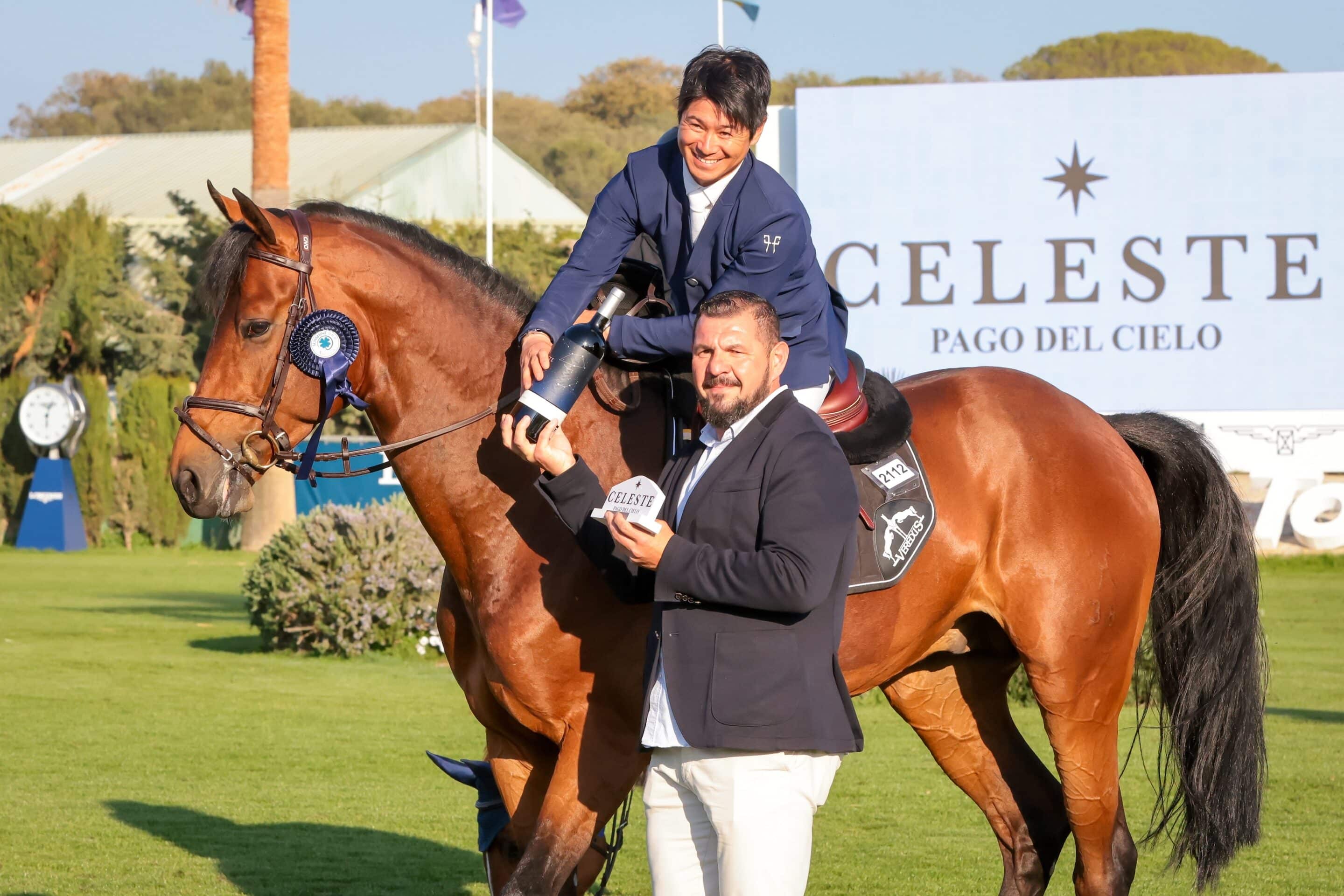 El japonés Eiken Sato se ha impuesto hoy en el Trofeo Celeste con ‘Melypso Blue PS FRH’, un caballo de diez años hijo de ‘Messenger’ x ‘Centadel’. El binomio impuso pronto su liderato en la prueba, parando el crono en 61.32 segundos, un tiempo imbatible para el resto de los 70 competidores que participaron en la prueba grande de esta jornada, saltada a 1.50 metros de altura en la pista verde principal David Broome.