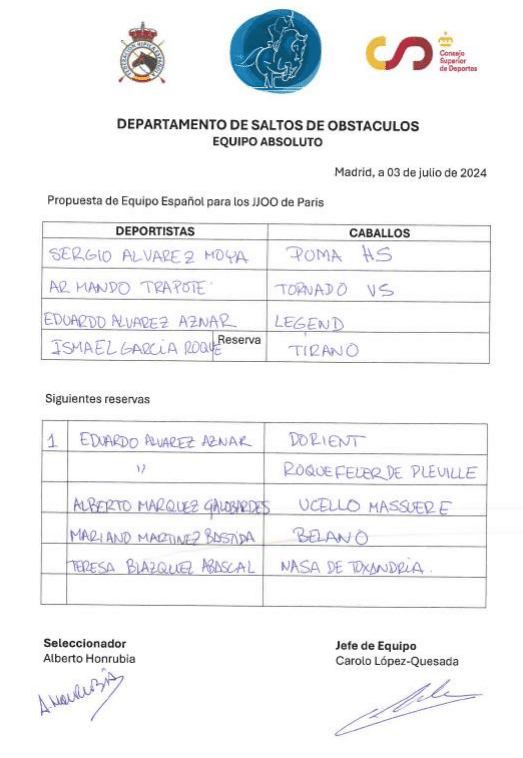 PRIMERO.- Con fecha 25 de junio se publicó la lista de inscripciones nominativas para los JJOO de París, en la que estaban inscritos los 7 jinetes y sus respectivos caballos designados por el Jefe de Equipo y el Entrenador de Saltos.